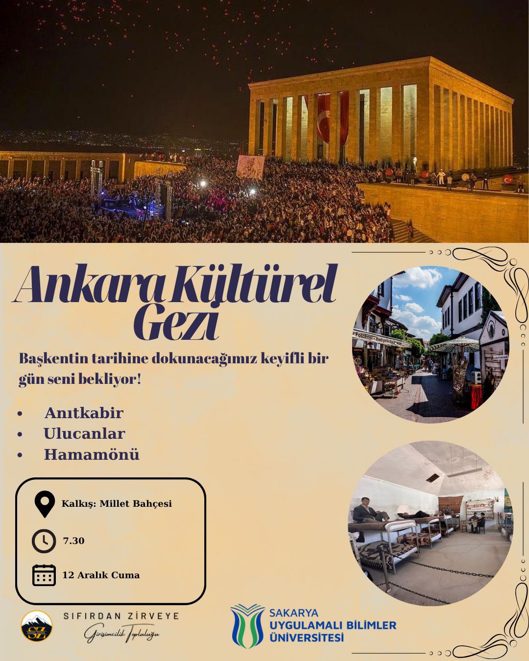 Sıfırdan Zirveye Girişimcilik Topluluğu tarafından öğrencilerimizin kültürel birikimlerini artırmak ve farklı şehirleri tanımalarına imkân sağlamak amacıyla Ankara’ya kültür gezisi düzenlenecektir. Program kapsamında katılımcılar, Başkent’in önemli tarihî ve kültürel mekânlarını ziyaret etme fırsatı bulacaktır.