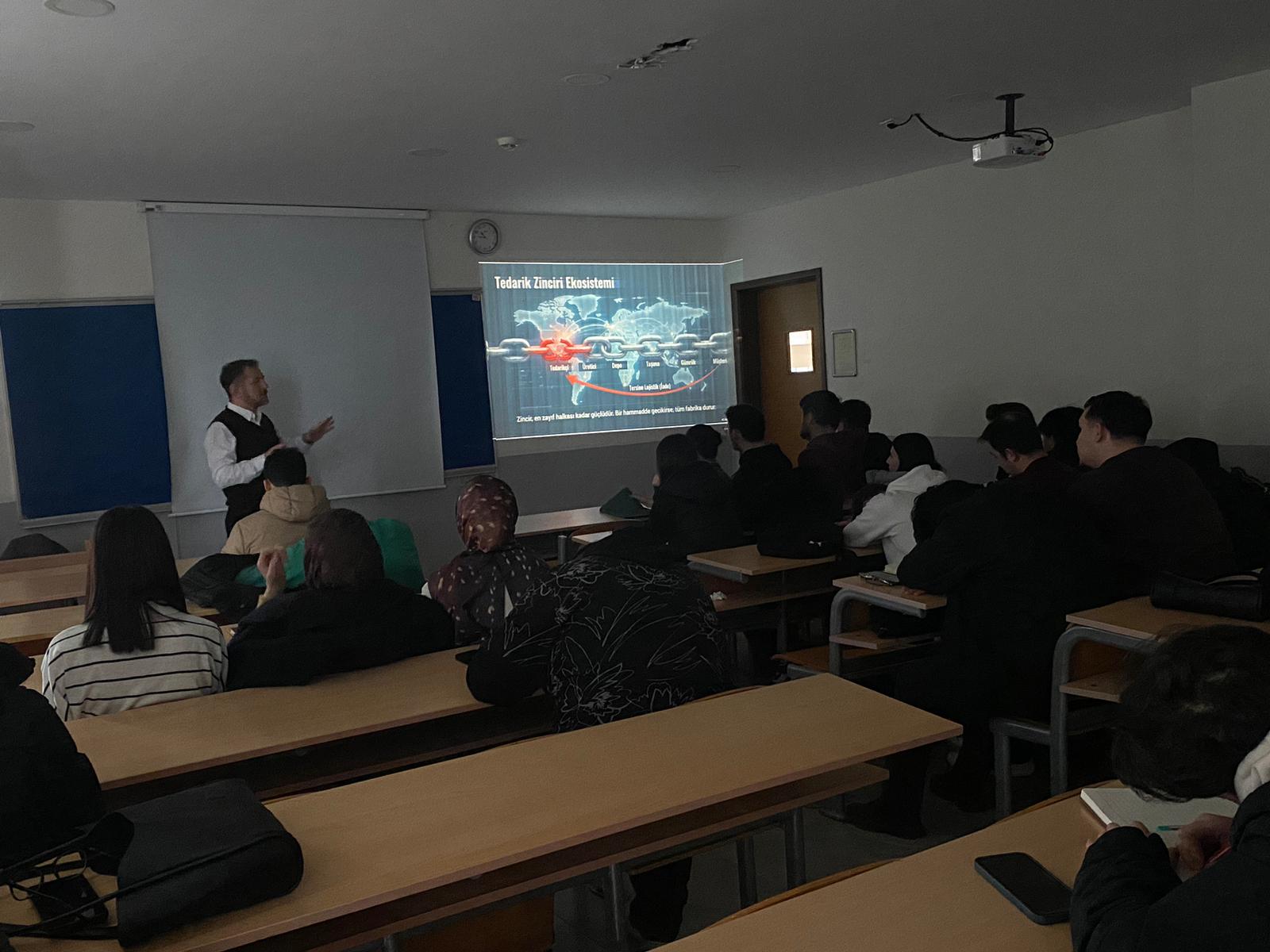 Gerçek sektör deneyimlerinden örnekler paylaşan Vodinalı, küresel pazarlarda rekabet edebilmenin yalnızca üretimle değil, doğru planlanmış ve etkin yönetilen lojistik süreçlerle mümkün olduğunu ifade etti. Öğrenciler, etkinlik boyunca yönelttikleri sorularla sürece aktif katılım sağladı.