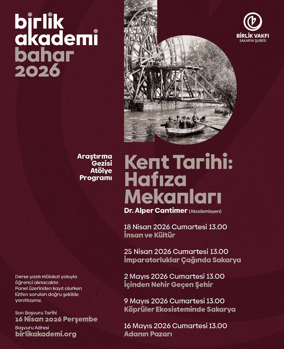 Birlik Vakfı Sakarya Şubesi tarafından düzenlenen Birlik Akademi Bahar 2026 dönemi kapsamında “Kent Tarihi: Hafıza Mekanları” başlıklı program gerçekleştirilecektir.